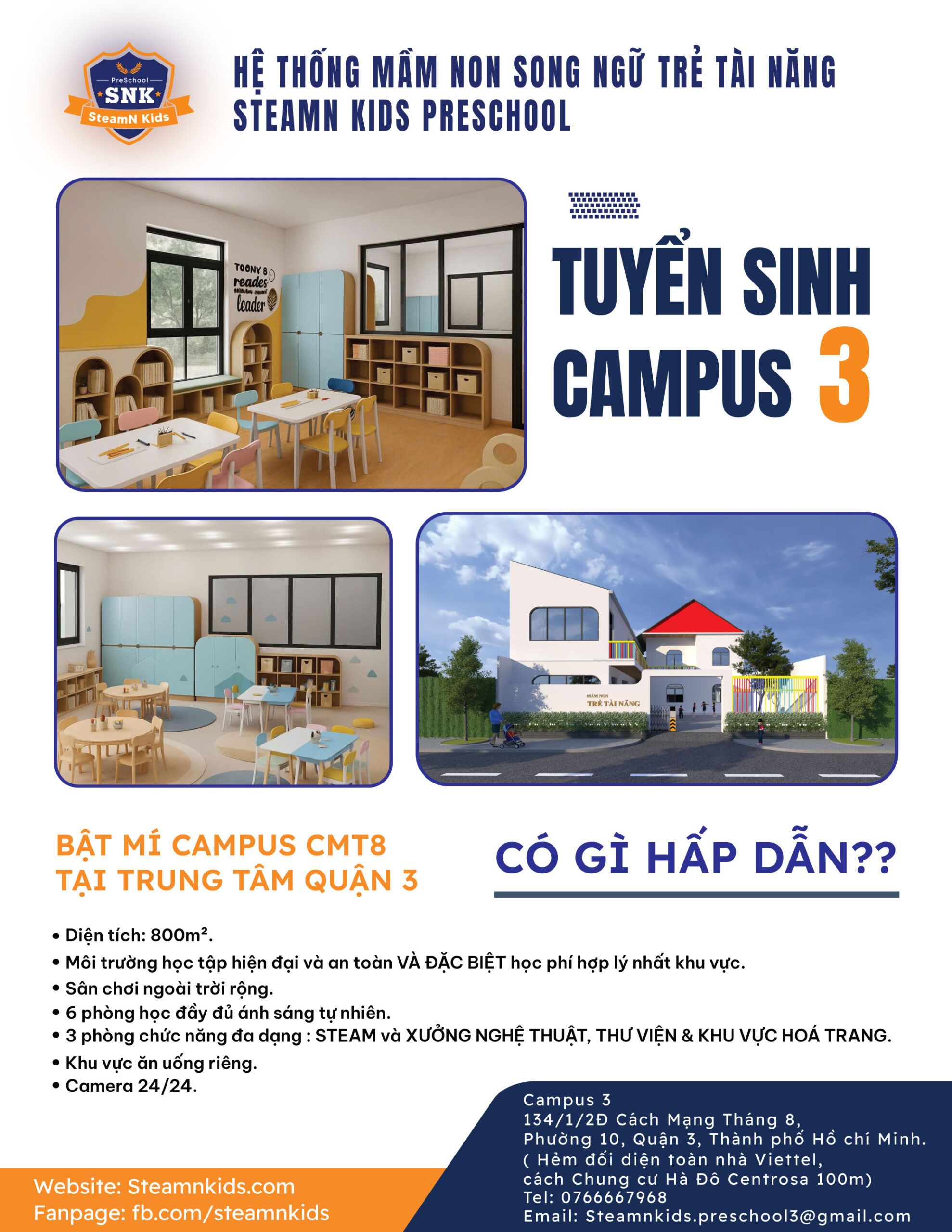 Tại SNK Preschool Campus 3, chúng tôi đặc biệt chú trọng đến việc xây dựng một môi trường học tập an toàn, sáng tạo và đầy cảm hứng cho trẻ, với những điểm nổi bật sau:
