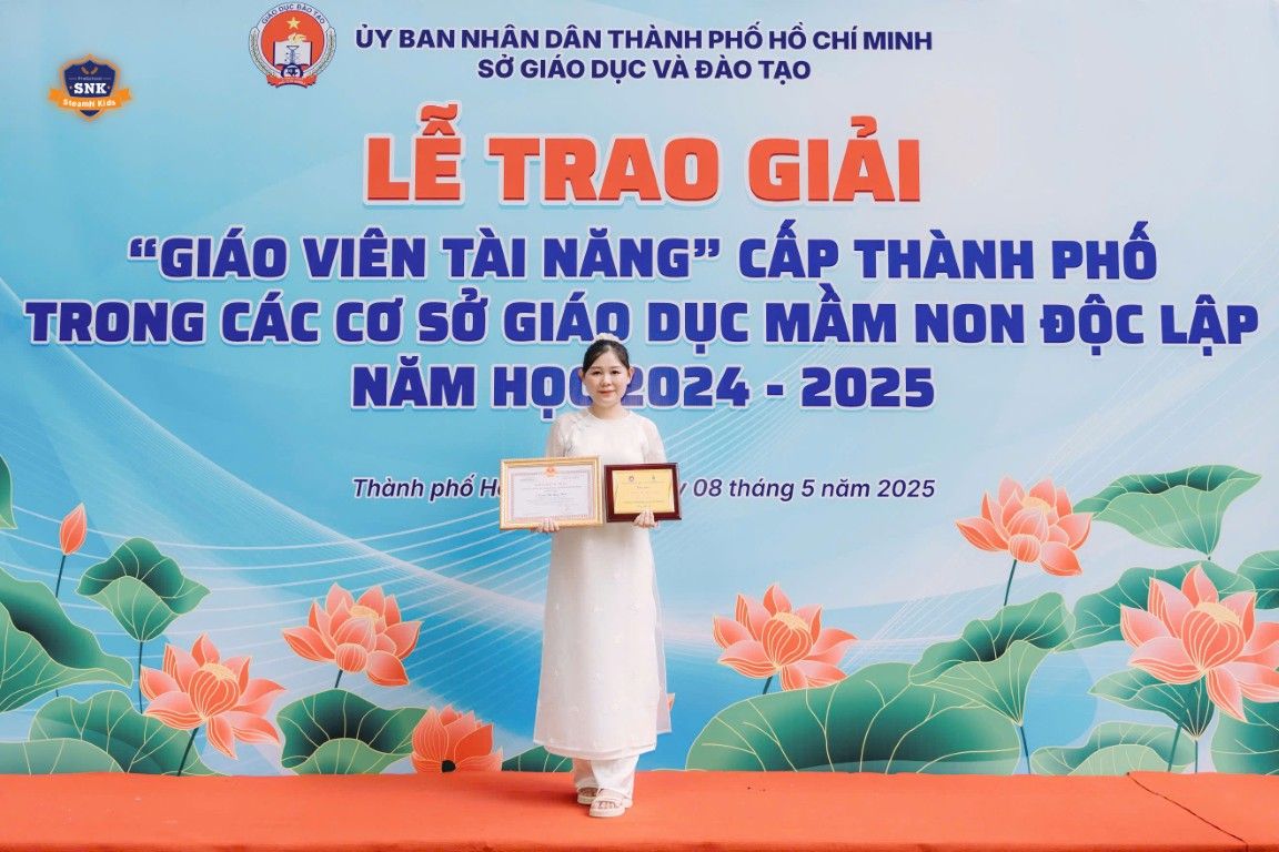 Sáng 8/5/2025, tại Lễ tổng kết Hội thi Giáo viên mầm non dạy giỏi cấp Thành phố và Hội thi Giáo viên tài năng do Sở GD&ĐT TP.HCM tổ chức, cô Trương Thị Mộng Trinh – giáo viên SNKs – đã vượt qua rất nhiều các ứng viên trên toàn thành phố và xuất sắc đạt GIẢI NHẤT cấp Thành phố.