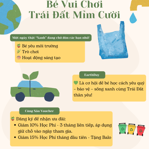 Workshop Hành trình ‘sống xanh’ Hành trình ‘sống xanh’ bắt đầu từ những điều nhỏ bé – Hãy cùng con khám phá tại workshop môi trường tuần này! 📍 Workshop “BÉ VUI CHƠI – TRÁI ĐẤT MỈM CƯỜI”- tuần n…