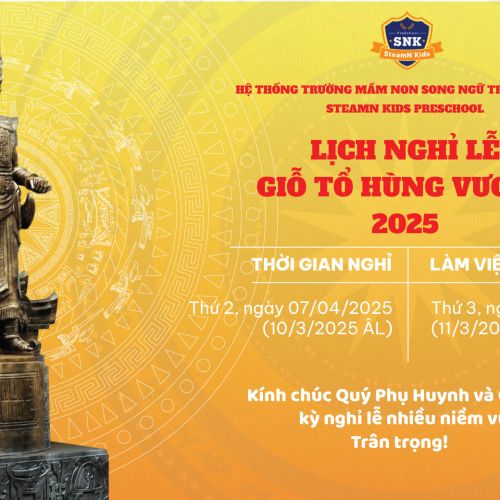 LỊCH NGHỈ LỄ GIỖ TỔ HÙNG VƯƠNG NĂM 2025 Kính gửi Quý Phụ Huynh và Gia Đình, Hệ thống Trường Mầm Non Song Ngữ Trẻ Tài Năng – STEAMN KIDS PRESCHOOL trân trọng thông báo lịch nghỉ lễ Giỗ Tổ Hùn…